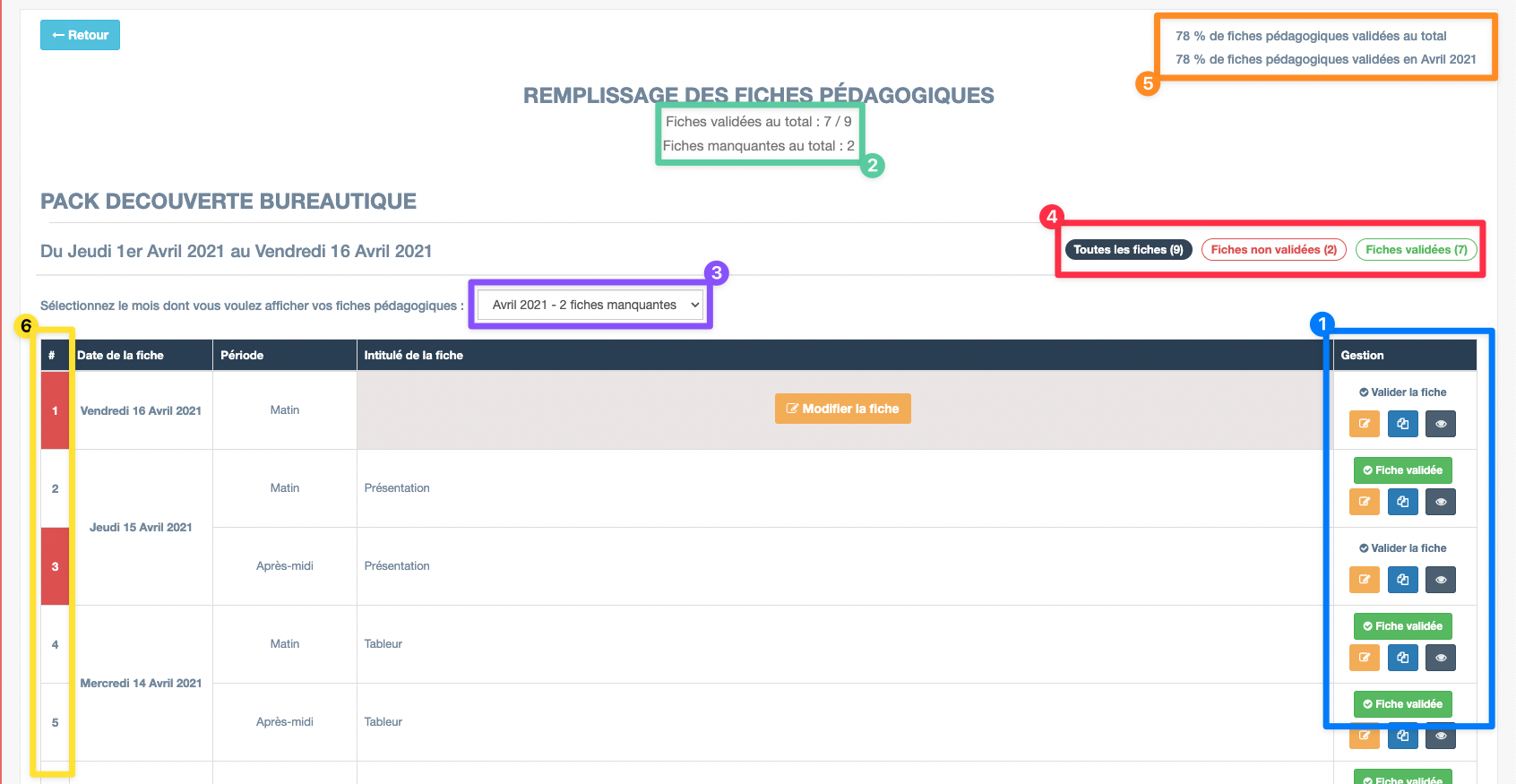 La page d'accueil de l'espace de remplissage des fiches pédaogigues possède les fonctionnalités suivantes :