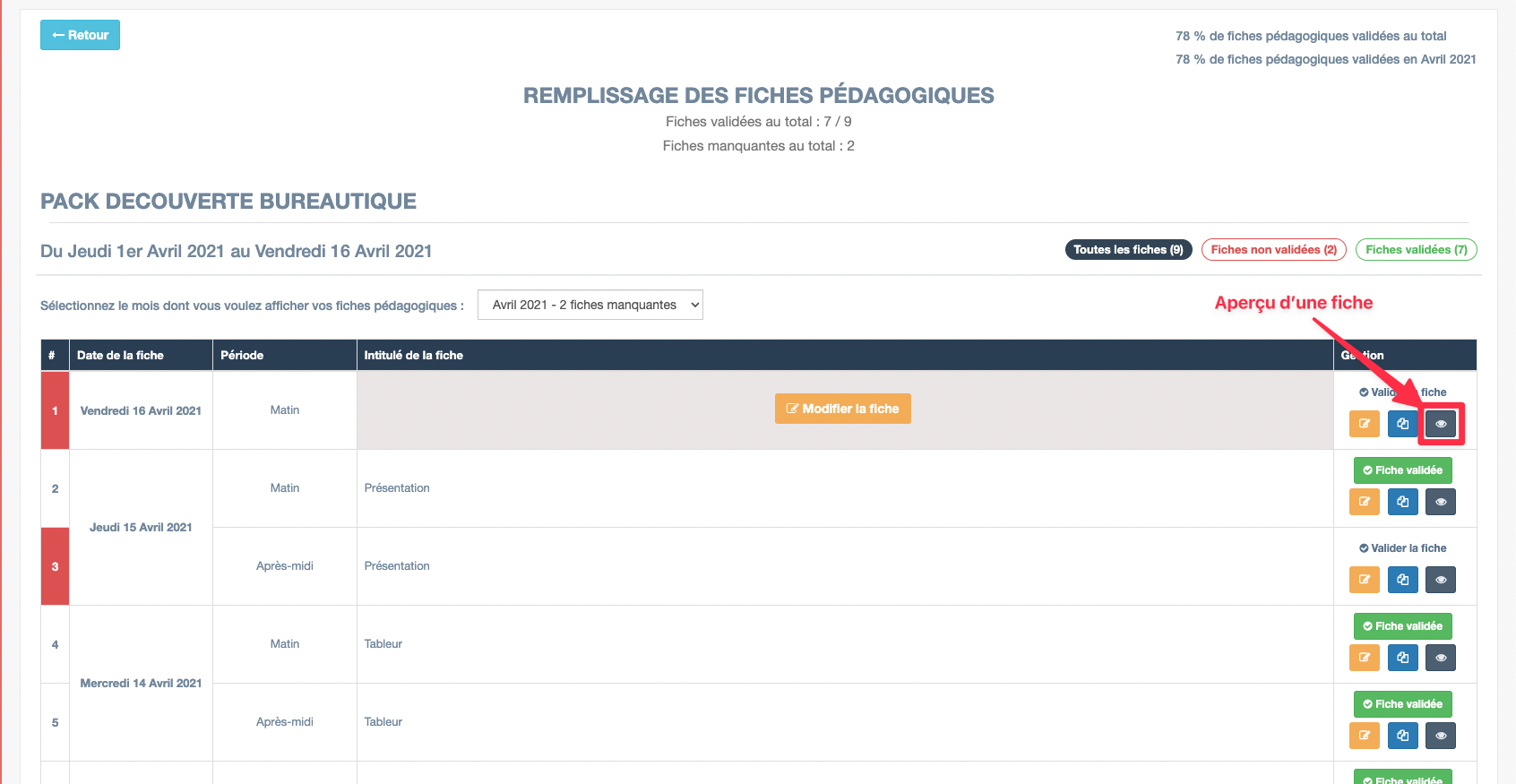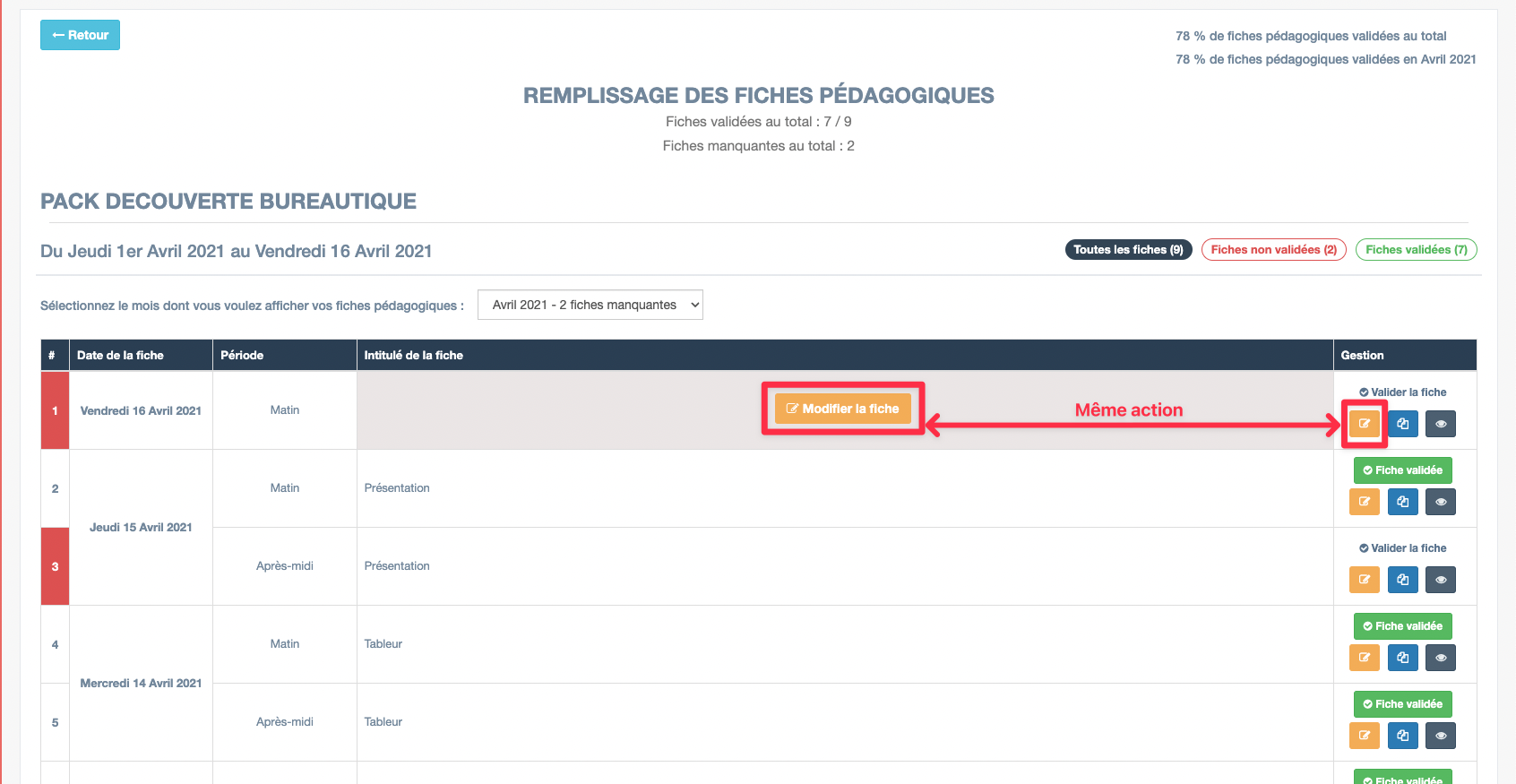 Afin d'accéder au remplissage d'une fiche pédagogique, cliquez sur le bouton "Modifier" si la fiche est vide
