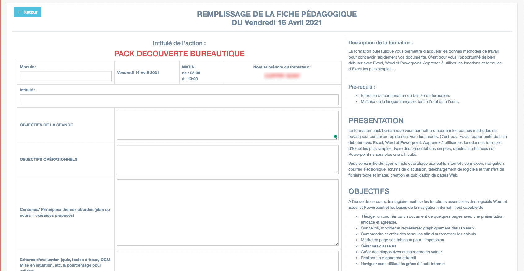Vous retrouverez également sur le côté droit la description de la formation pour vous épauler dans le remplissage de la fiche.